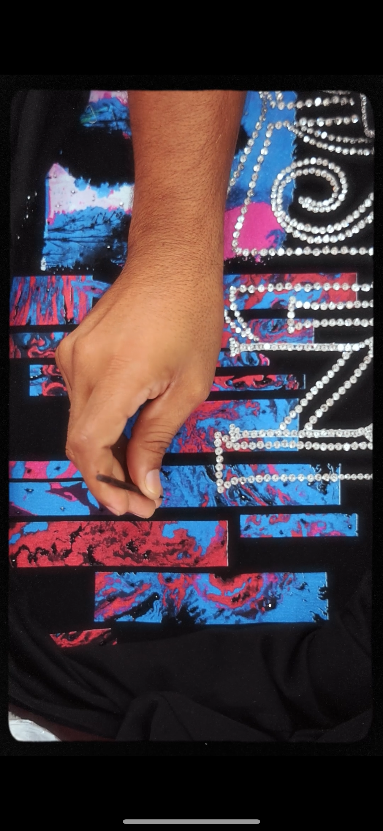 Stud and typography accented with hand-set crystals, giving a refined shine without losing the grit of the art