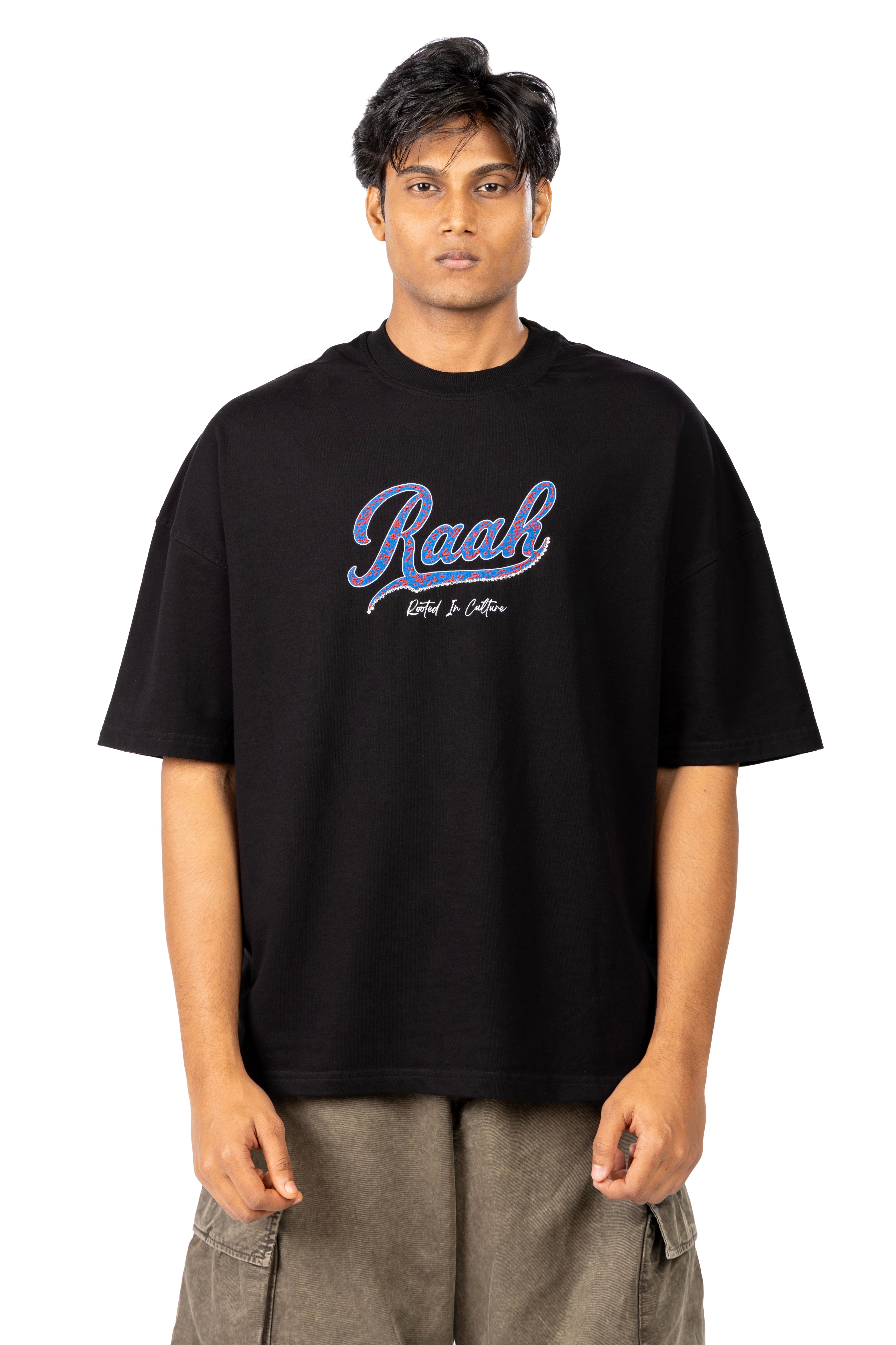 RAAH celebrates Indian heritage through timeless artistry Zari, Zardozi, Karigari, and ancient hand-block prints. Each craft carries centuries of culture, revived and reimagined in bold contemporary forms. Rooted in tradition yet fearless in expression, RAAH merges heritage with modern street wear, making culture not just remembered, but lived.
